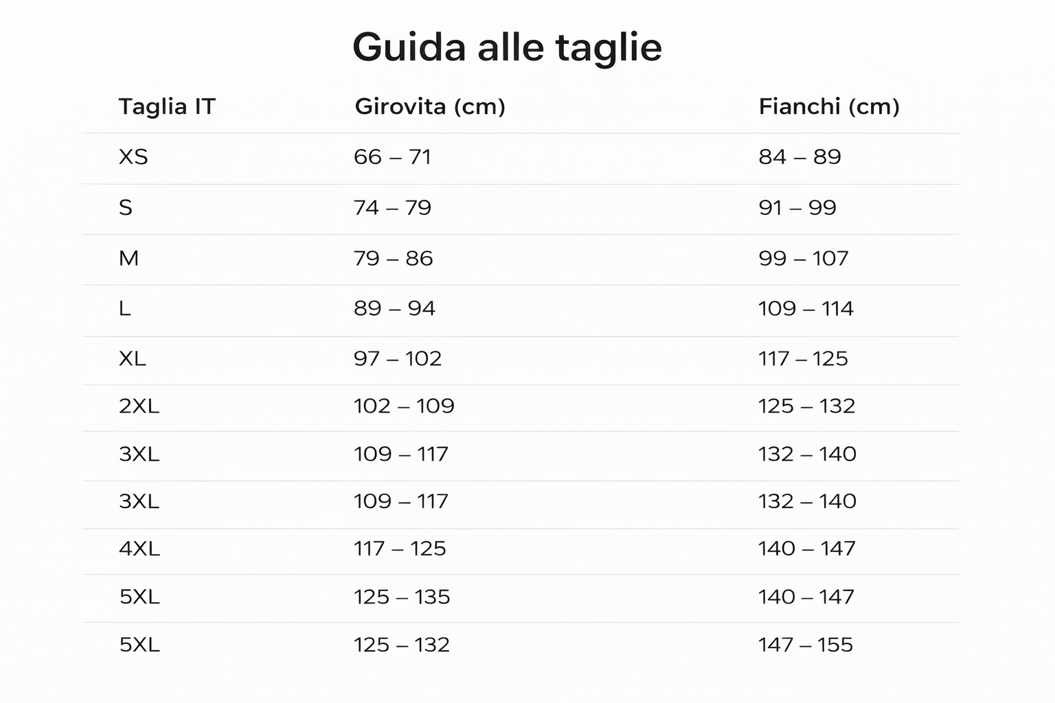 Per trovare la taglia giusta, consulta la tabella delle taglie qui sotto. Tutte le misure sono espresse in centimetri.
